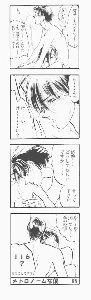 フジミ4コマ*8 メトロノームな僕 コンクールに向けての練習の日々。リズム感の悪さを指摘され、メトロノームの日々。 全てが遅めの♪=116に支配されていた守村さんだから……^^; なんて解説しちまうと、落ちがね。まいっか。
