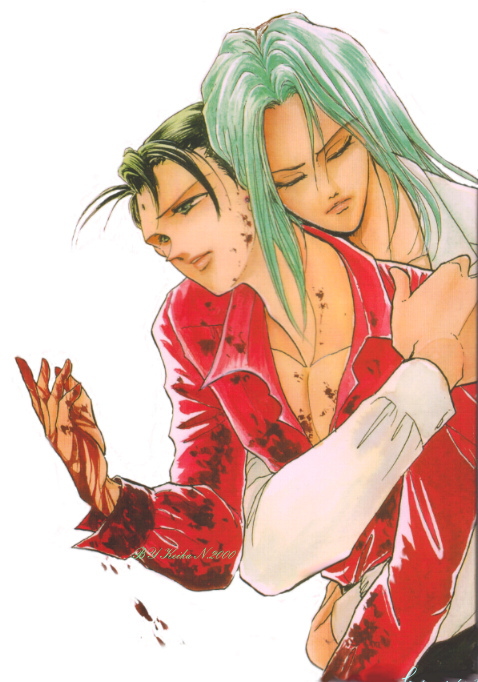 好きにならずにいられない・表紙イラスト 原稿はゲストにストマンを書いてくれた秋山嬢に進呈。 故に印刷物をスキャンして、タイトル、バック等を消去しました。 元々バックは白地なんです。 忍にはやっぱり血糊が似合うよね。